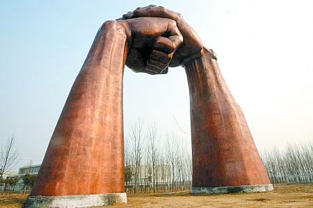 在鄭州西四環(huán)連霍高速下站口處,新立起一尊30米高的鍛銅雕塑,格外醒目。該雕塑是一雙抱拳的手,雕塑師們給它起了個(gè)好聽的名字叫“禮儀之門”。